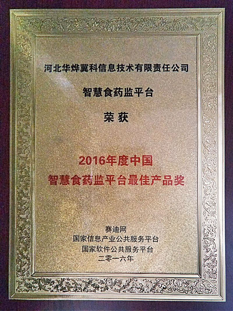 2016年12月16日,由賽迪網(wǎng)主辦的 "科技原力覺醒、引領(lǐng)創(chuàng)新巔峰 ",2016年創(chuàng)新影響力年會(huì)中,我公司的“智慧食藥監(jiān)平臺(tái)”獲得 "2016年度中國(guó)智慧食藥監(jiān)平臺(tái)最佳產(chǎn)品獎(jiǎng) "。